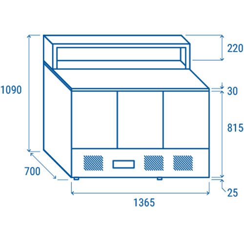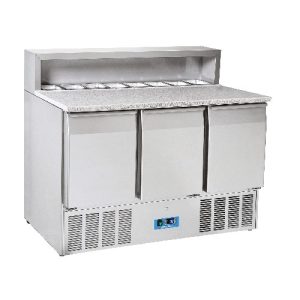 Saladeta CRP 93A, z granitno delovno površino, je v celoti narejena iz inoxa. Primerna je za osem GN 1/6 posod. Opremljena je s statičnim hlajenjem, avtomatskim odtajevanjem in digitalnim termostatom. Ima ločeno posodo za vodo. Debelina izolacije je 45 mm. Odstranljiva tesnila vrat. Troja vrata. Vrata se zapirajo sama in s tem se prepreči odvečno uhajanje hladnega zraka. Odstranljiva tesnila vrat. Po višini nastavljive nogice.